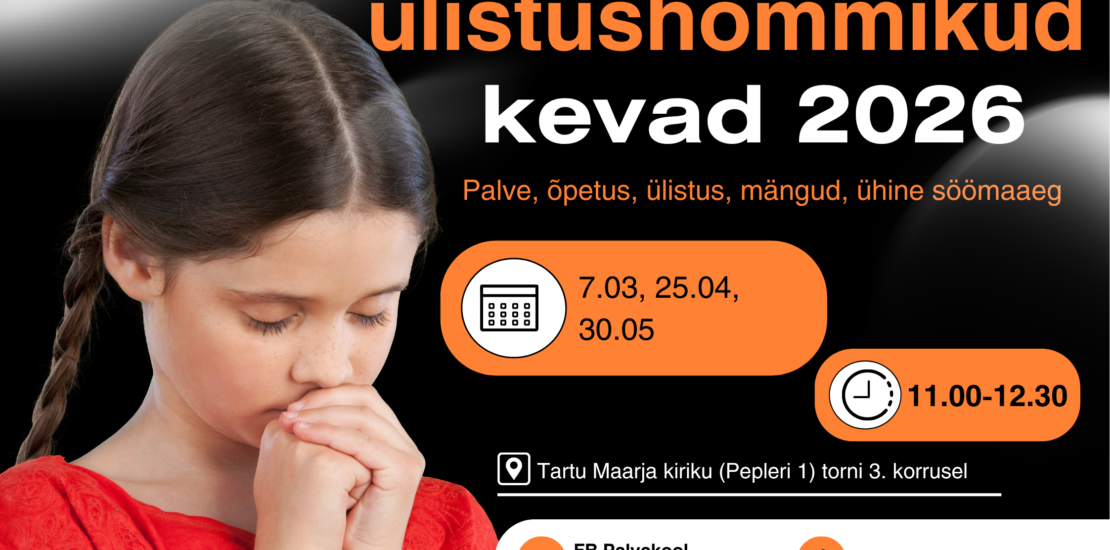 Ülistushommikud toimuvad Tartu Maarja kiriku 3. korruse osadusruumis. Täpsem info palvekool (ätt) gmail.com või tel 5355 5883