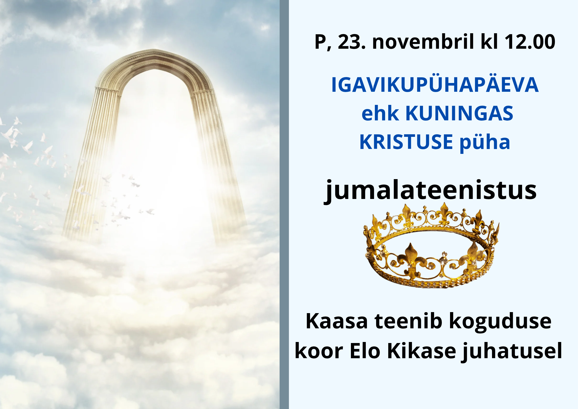 Kirik on avatud juba alates kell 10. Enne jumalateenistust kell 10.45 pühapäevakool, kl 11.30 ülistuskool. Pärast jumalateenistust on kõik teretulnud ühisesse kohvilauda!