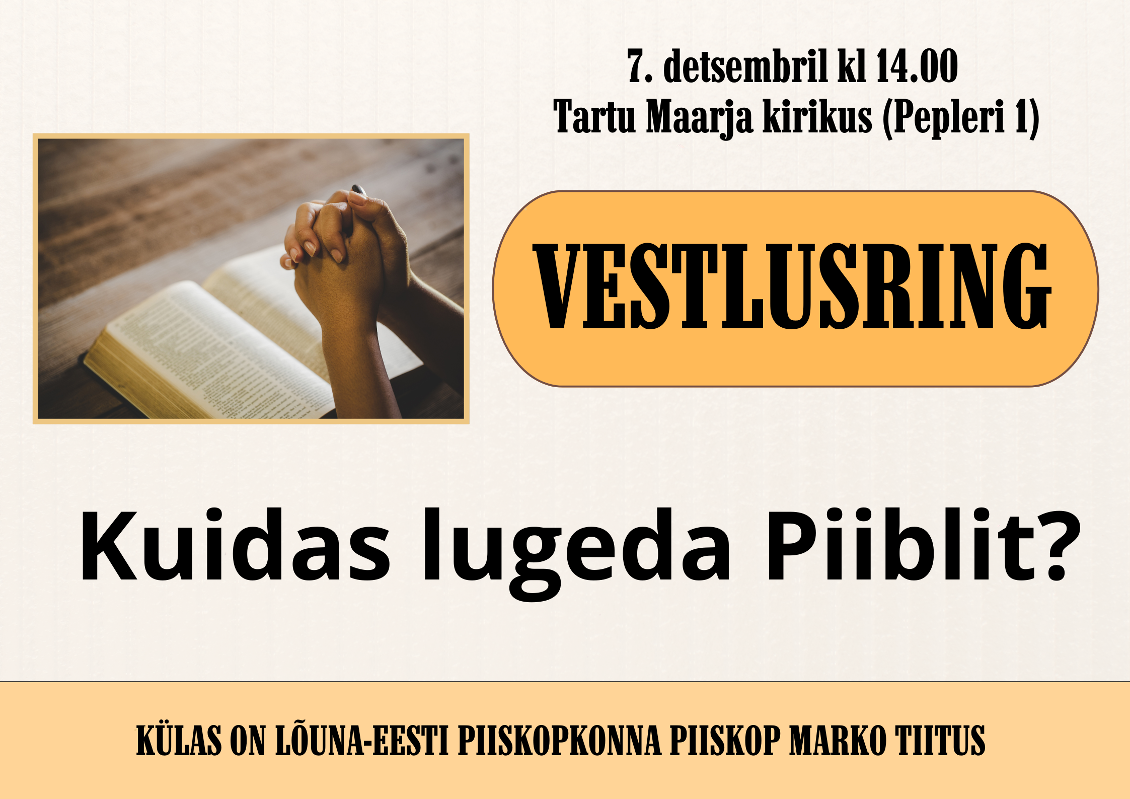 Vestlusring Piibli teemadel. Külas on Lõuna-Eesti piiskopkonna piiskop Marko Tiitus December 7, 2025 14:00 to 16:00 Tartu Maarja kiriku (Pepleri 1, Tartu) torni 2. korruse saal join now Info Uncategorized Sündmused Sündmuste arhiiv Ilmavalgus